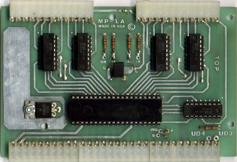 The MP-LA Parallel Interface is a 5 1/4 inch x 3 1/2 inch board implemented with the 6821 peripheral interface adapter integrated circuit which is used to interface a parallel data device to the computer. The board is provided with two separate connections along the edge of the board. Each connector contains eight data lines which may be programmed for either outputs or inputs, one "data ready" line, and one "data accepted" line for full handshake control. All data lines are fully buffered with bi-directional transceivers to allow eight inputs and eight outputs, 16 inputs and no outputs or 16 outputs and no inputs. Programming of a particular set of data lines is done via jumpers on the MP-L board. Software control of interrupt lines and the polarity of the handshake lines is provided.