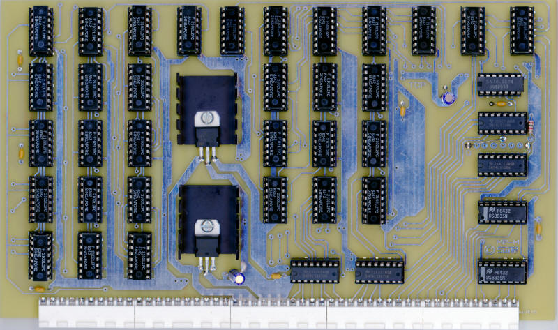 The MP-M memory card is a 5-1/2" x 9" double sided plated thru hole board with a total storage capacity of 4096 words of 8 bit random access memory. The kit, however is supplied with only half (2,048 words) of its memory capacity. To bring the board to maximum capacity, you must purchase the MP-MX memory expansion kit. The circuitry on the board provides all the address decoding and data line buffering to handle a total of 32 (1K bit x 1bit) 2102 type static random access memories. All interconnections to the system are made via a 50 pin connector to the motherboard (MP-B). +5 volt power for the board is supplied by a on board regulator with heat sink for each 2,048 words of memory. Current consumption is approximately .75A for every 2,048 words of memory.