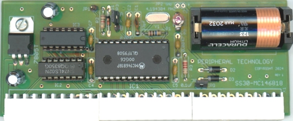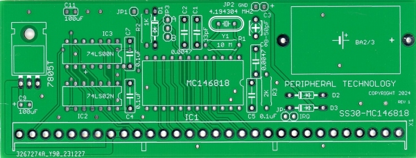 The PT-146818 is an SS30 clock board for the SWTPC 6800 or 6809 system. It can be used in 1MHZ or 2MHZ systems. In a FLEX system the RTC is used to set the date. The SET6818 utility allows the date and time to be set in either 12 or 24 hour format. SET6818 will also display the date and time. When used with OS9 the PT-146818 will supply a source of periodic interrupts. OS9 uses these interrupts to switch tasks and to keep its clock. OS9's clock is a software clock, and the PT-146818 is used to set the initial date/time at power up and is a source of periodic interrupts.