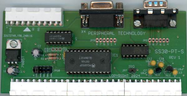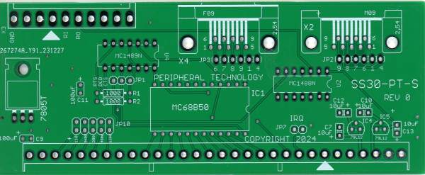 This is a modern replacement for the SWTPC MP-S serial board. It has DB-9F, DB9-M, and a Molex connector like SWTPC used on the MP-S. Only one RS232 connector can be used at a time. The multiple connector choices are to allow for maximum flexibility and ease of connecting an RS-232 cable between your computer and terminal. The DB-9 connectors support USB to RS232 cables to allow a cable to plug between the PT-S and a USB port on your PC. This board uses an MC68B50 to support 2MHZ operation.
