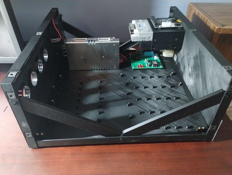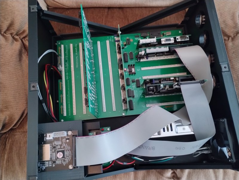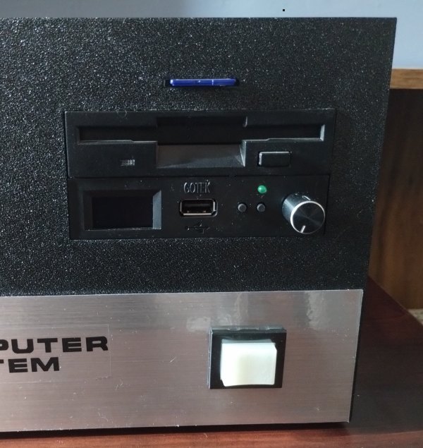 The cabinet is available in two configurations. One is like the original SWTPC, and the other has an opening for two GoTek drives or even a 3.5" real drive. Above the drive opening is a slot for an SD memory card. There are mounting pads above the drive bay for an SD to IDE adapter. The power supply has a regulated 5V supply to power a GoTek/floppy drive.