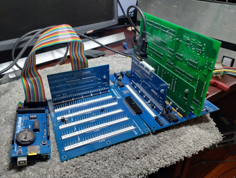An example of a Motherboard with extender. This system has a SWTPC reproduction MP-09B, PT-64K Memory board, Corsham Serial board and Corsham parallel board with SD card system.