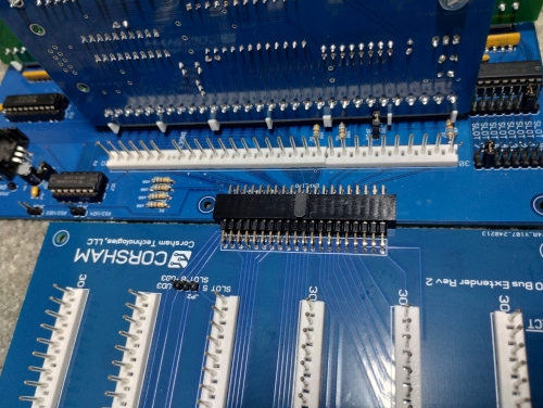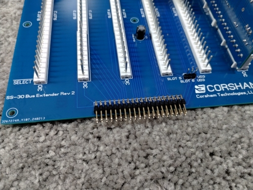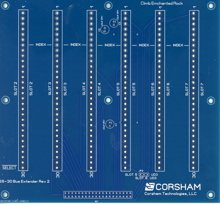 For those of you using the Corsham SS-50 motherboard and find yourself needing more I/O ports, this board will add an additional six SS–30 ports via a connector already on your motherboard. This extender simply plugs in and you’ll have the full eight slots available for more I/O boards. This motherboard has fixed slot addresses and cannot be changed like the two on the SS-50 Motherboard. When using this extender you should set the slot address on your motherboard to 0 and 1.